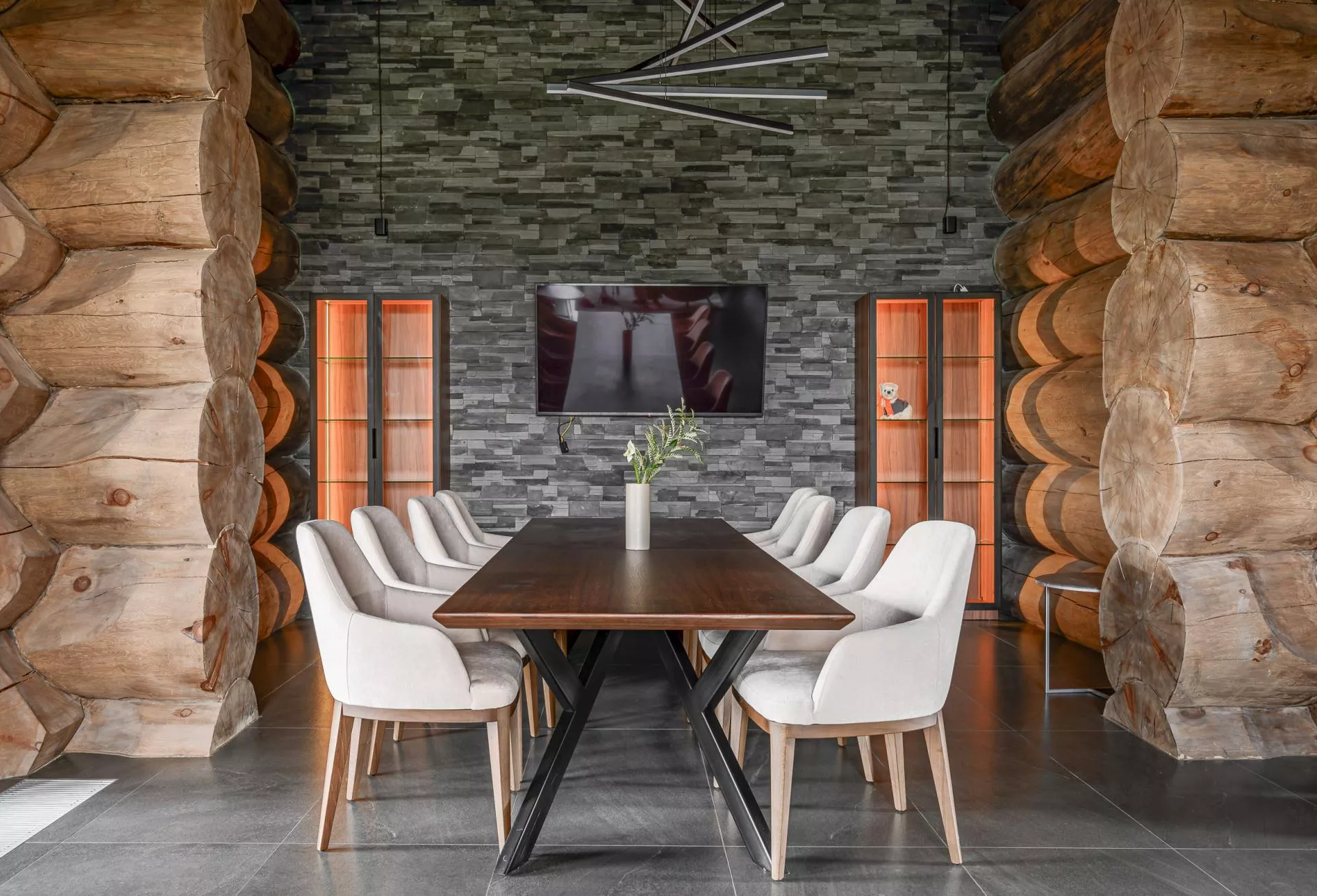 - Комнату отдыха - уютное пространство с комфортабельным диваном и банкетным столом, где можно расслабиться до или после процедур. Панорамные окна позволяют наслаждаться видом на окружающую природу, а телевизор обеспечивает дополнительное развлечение.