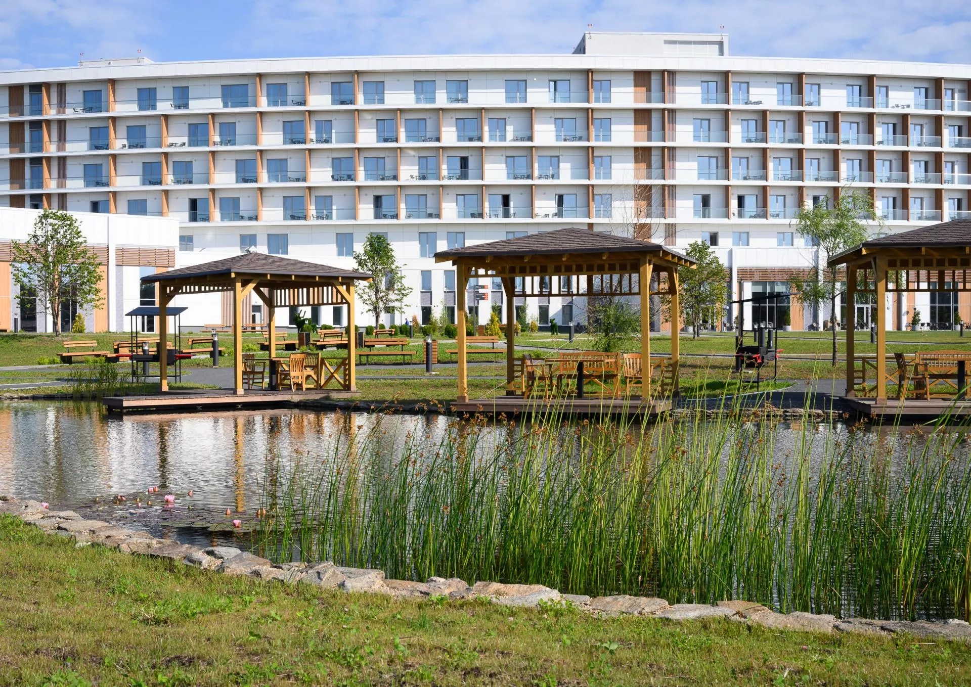 Уютные деревянные беседки у озера идеально подойдут для барбекю с семьей, деловой встречи в неформальной обстановке и медитативного отдыха на природе.